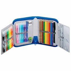 Estuche decorado y lleno de útiles escolares. El estuche lleno consta de 31 piezas con útiles para escribir, pintar y dibujar.