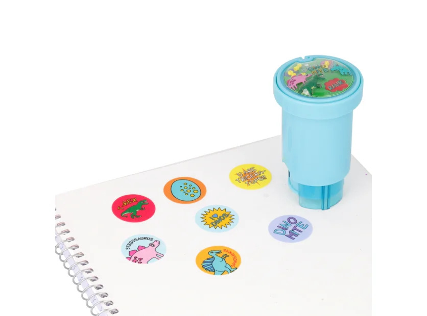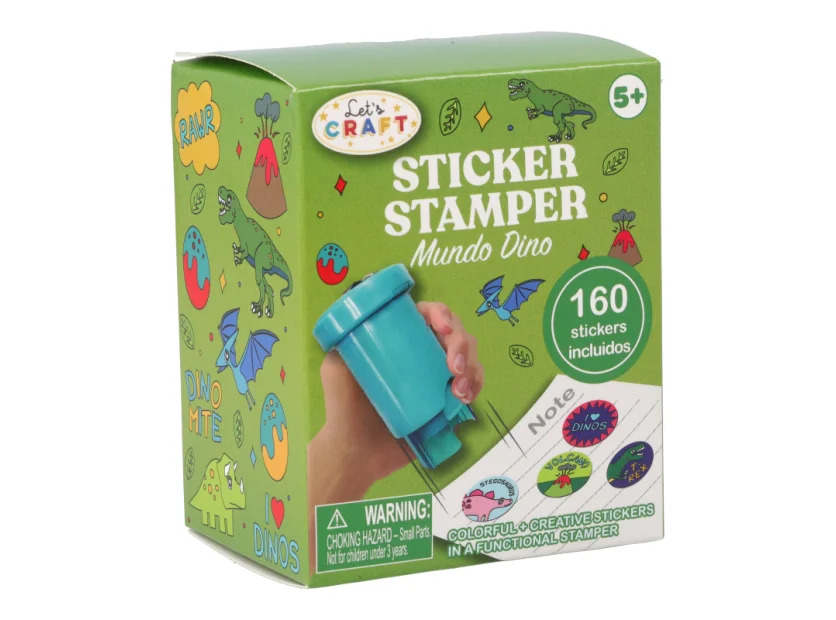 Pueden personalizar los útiles con el Sticker Stamper Mundo Dino. Un set creativo con sellos y 160 stickers para decorar cuadernos, agendas y más. Ideal para estudiantes y amantes de la papelería. Edad recomendada +5 años.